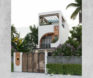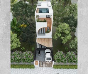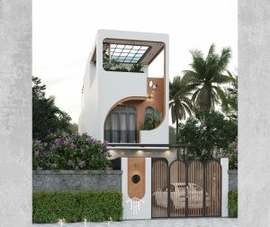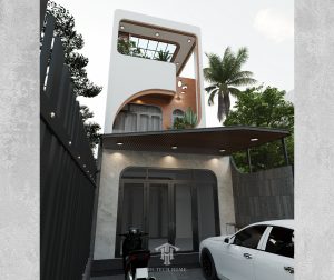 Một thiết kế nhà phố tối giản nhưng tinh tế, với đường cong mềm mại và gam màu nâu – trắng hiện đại.